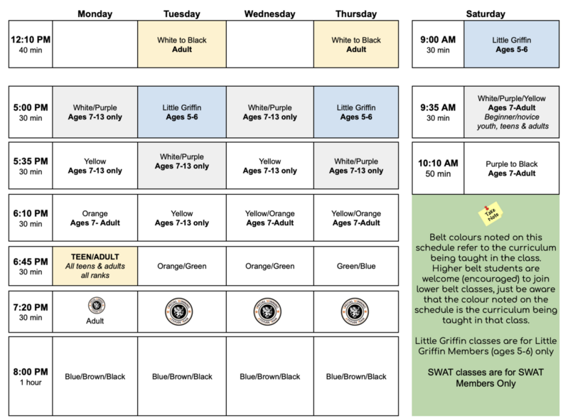White/Purple belt: 1 hour per week (2 x 30 min classes)